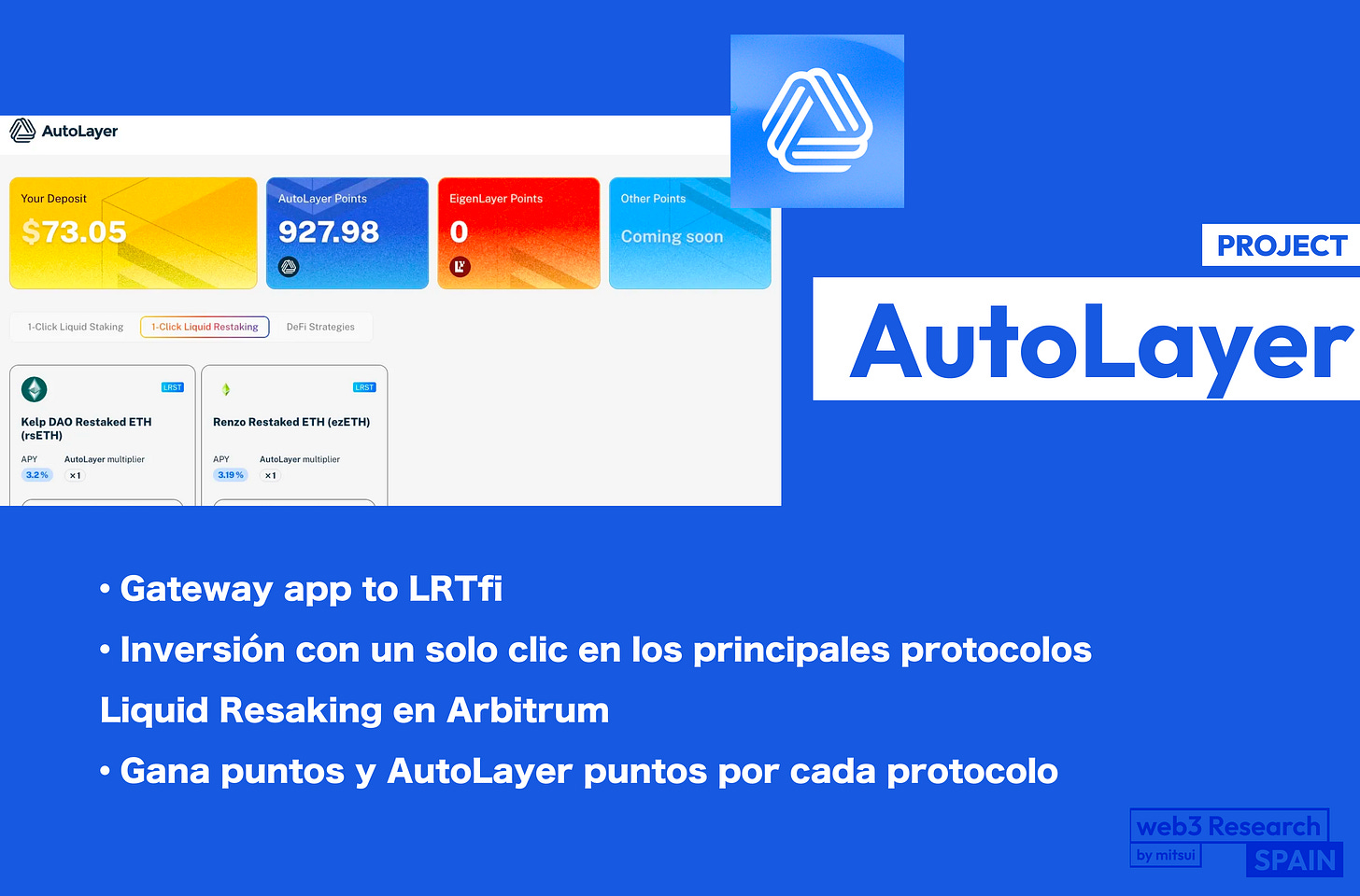 【AutoLayer】Gateway app to LRTfi / Inversión con un solo clic en los principales protocolos Liquid Resaking en Arbitrum / Gana puntos y AutoLayer puntos por cada protocolo / @AutoLayer