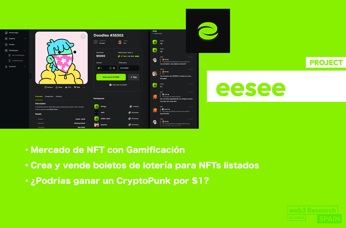 "eesee" es un mercado de tokens que incorpora gamificación. Permite la compra y venta de NFTs, FTs y tokens RWA al incorporar elementos de juego.