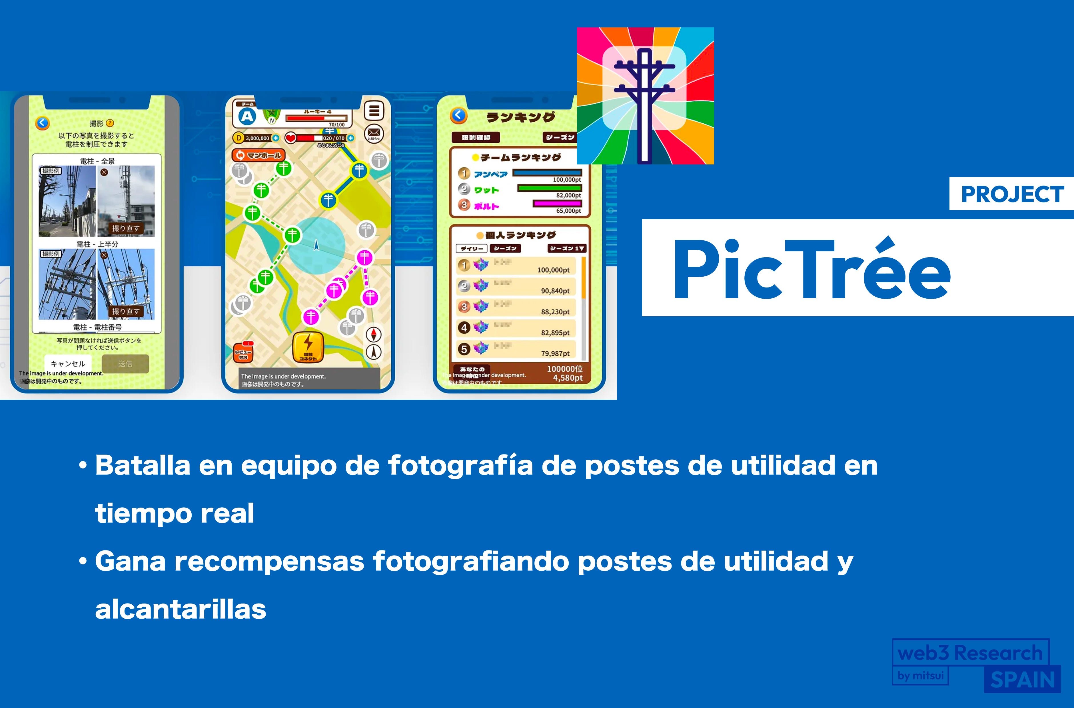 "PicTrée" es una aplicación de juego móvil gratuita en la que los jugadores toman fotos de activos de energía como postes de utilidad y bocas de acceso, y compiten por la longitud de las líneas de energía conectadas. Al cooperar en el mantenimiento de la infraestructura cercana, los jugadores pueden contribuir a contribuciones sociales como la detección temprana de anomalías en el equipo y ganar recompensas. Es una forma de proyecto DePIN.