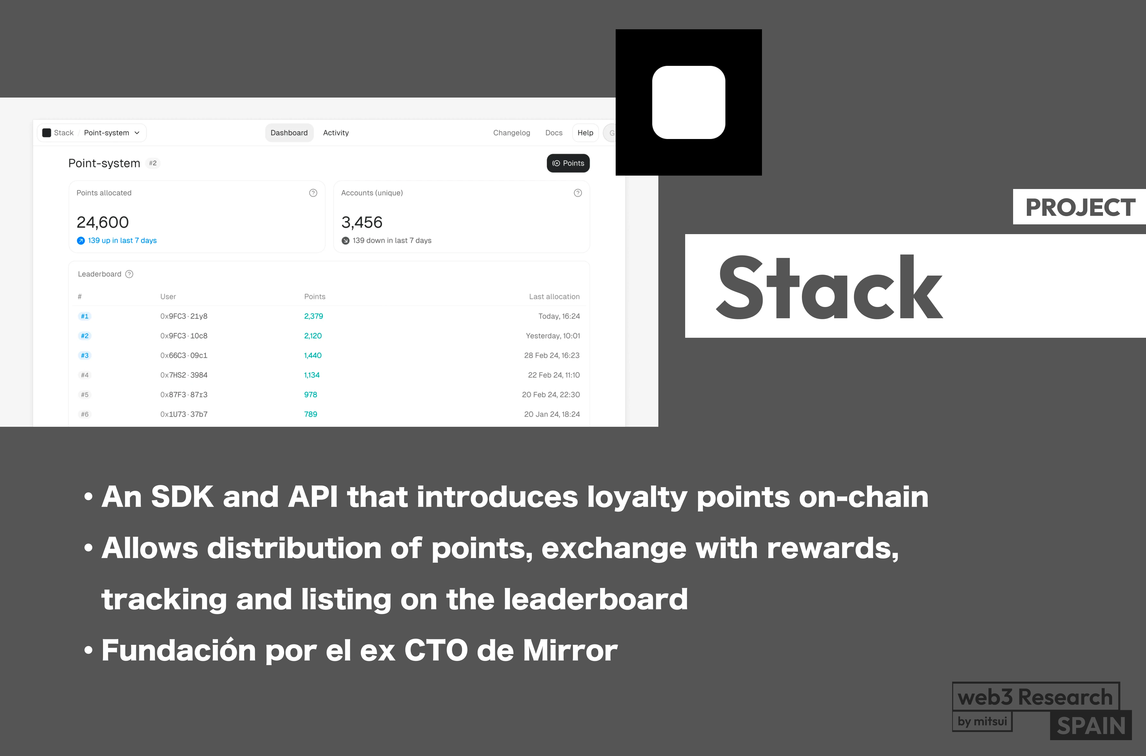 "Stack" es un servicio que proporciona un SDK que permite introducir puntos de lealtad en cadena. Al integrar el SDK en sus propios servicios, las empresas pueden distribuir puntos, intercambiarlos por recompensas, y rastrearlos y listarlos en tablas de clasificación.
